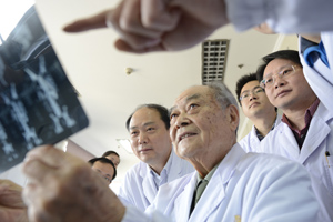 主任醫師江志偉:老爺子他所有的幸福,所有的興趣愛好和追求,就是為病人服務。星期一早晨院士門診,星期二上午要在37病區的重癥監護病房看重病人,星期三在另外一個8病區,也是重病人,星期四早上在我們大病區查一個上午,星期五上下午都是業務學習。他十幾年、幾十年都是這樣。