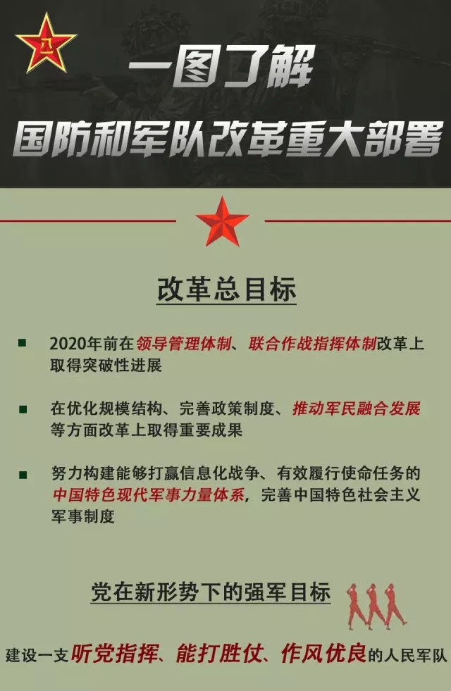 2020年前要在領導管理體制、聯合作戰指揮體制改革上取得突破性進展,在優化規模結構、完善政策制度、推動軍民融合發展等方面改革上取得重要成果,努力構建能夠打贏信息化戰爭、有效履行使命任務的中國特色現代軍事力量體系,完善中國特色社會主義軍事制度。