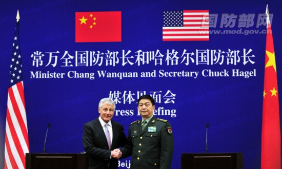 4月8日,國務委員兼國防部長常萬全上將在八一大樓與來訪的美國國防部長哈格爾共同舉行新聞媒體見面會。