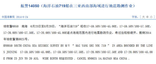 人民網北京6月24日訊 據中國海事局網站6月24日消息,6月23日至8月20日,“海洋石油719”船在三亞西南部海域進行地震勘探作業,要求過往船舶避開。