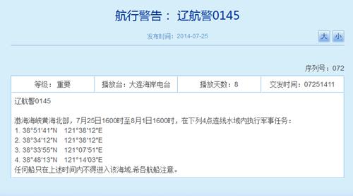 人民網北京7月25日電 據遼寧海事局網站消息,7月25日16時至8月1日16時,在渤海海峽、黃海北部相關水域將執行軍事任務,要求期間任何船只不得進入該海域。