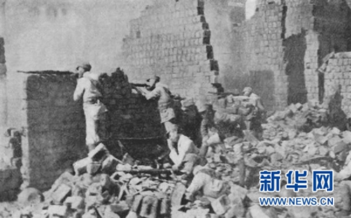 中國軍隊在廢墟中向日軍射擊。 9月8日,國家檔案局在其官網發布了《浴血奮戰——檔案里的中國抗戰》第十五集:萬家嶺大捷。 新華社發(中國第二歷史檔案館提供)