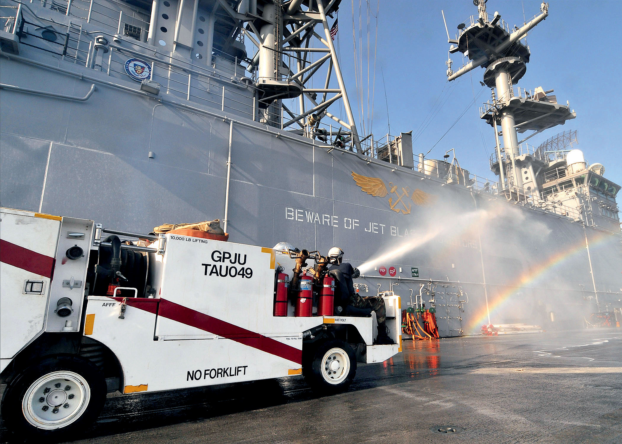 目前,美國航母和兩棲攻擊艦采用的自行式甲板消防車是P-25,甲板上起飛、降落區各一輛,機庫內另配置一輛。