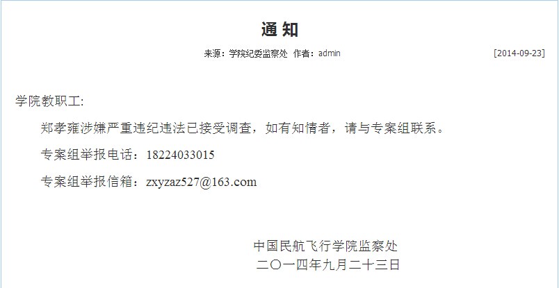 人民網北京9月24日電 據中國民用航空飛行學院紀檢監察網通知公告,中國民用航空飛行學院院長鄭孝雍因涉嫌嚴重違紀違法已接受調查。