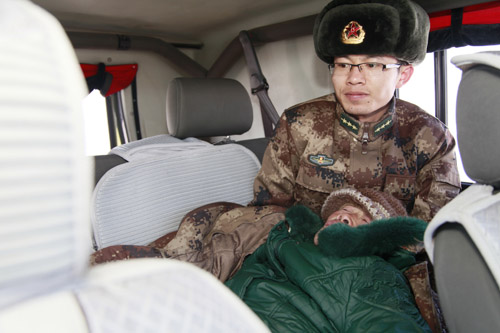 這時,從對講機中獲悉這一突發情況的團保障處處長靳東,帶著勇士越野車火速趕到。隨后,官兵們紛紛伸手,合力把老大娘抬上了車。
