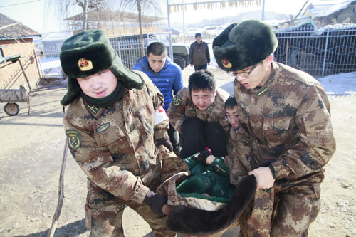 “當時,氣溫約—20攝氏度,天又下著雪,我們在一條鄉村路路邊發現了她!睂m營長介紹說,老大娘當時渾身發抖,眼睛半閉,雙手冰涼,呼吸十分微弱。見此情景,該團保障部營房股助理岳耀勇與上等兵丁新新立即把身上的棉大衣脫下來,裹在老大娘身上幫她御寒取暖。