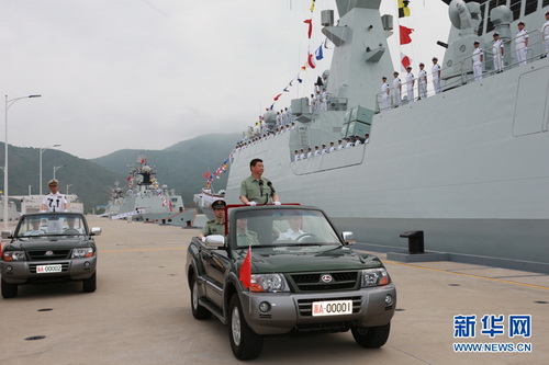 2013年4月9日,習近平檢閱水兵儀仗隊后,登上敞篷車,在雄壯的閱兵曲中依次檢閱岳陽艦、衡水艦、玉林艦等艦艇。新華社記者 李剛 攝
