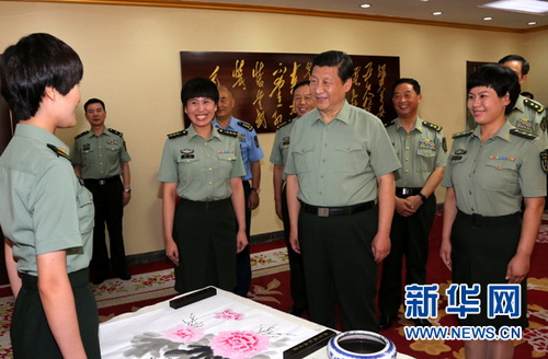 7月29日,習近平接見北京軍區機關團以上干部。他還參觀軍區某通信團六連榮譽室,認真聽取連隊情況介紹。他深入士兵宿舍,詳細了解她們的工作、學習和生活情況,饒有興致地觀看官兵自編自演的快板、舞蹈、器樂演奏等文藝小節目。在連隊才藝室,習近平不時駐足仔細觀看官兵們剪紙、書法、繪畫練習和插花制作,并高興地接受了官兵們創作的“中國夢?強軍夢?我的夢”剪紙作品。
