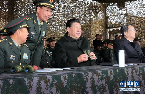 2014年4月29日,習近平在新疆軍區綜合訓練場實地觀摩部隊實戰化訓練課目演示。新華社記者 李剛 攝