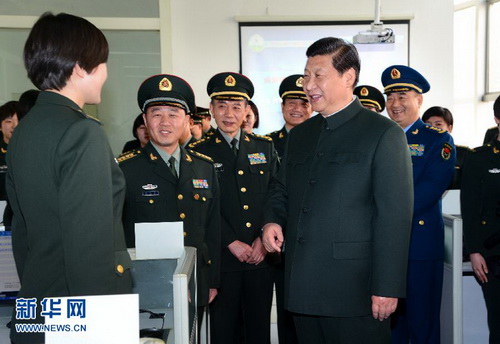 2013年2月4日,習近平來到蘭州軍區某通信團執勤機房,看望正在值班的官兵,詳細了解她們的學習、工作情況。 新華社記者 李剛 攝