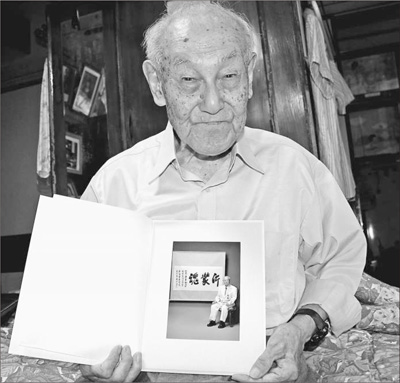 小林寬澄在家中向記者展示他在“沂蒙魂”書法作品前身著正裝、佩戴紀念章的照片。劉軍國 攝