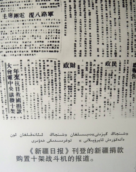 (成都二十日電)新疆省十四族同胞憂愁國難嚴重,自動踴躍輸捐,購機十架呈獻國家。二十日上午九時,在某地舉行獻機命名典禮,張元夫代表獻機,到會數千人。儀式莊嚴熱烈,空前未有?谷諔馉幈l后,為了響應全國抗戰的號召,表示一致抗戰到底的主張,(新疆)亦通電全國,其中有:“新疆雖僻處邊陲,抗日救國,尤為吾人之素志,枕戈待旦,誓與國人共同奮斗”等壯語。自從全面抗戰開始以至今天,每逢捷報傳來,無不通電慰問,……次種無形的援助,對于抗戰國策決定與堅持,對于前線將士及全國同胞所給予的鼓勵,不是用數字所能表示出來的。