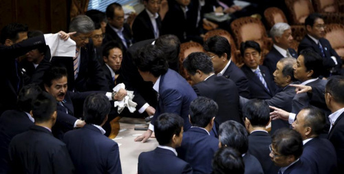 17日,日本執政黨與在野黨就參院和平安全法制特別委員會上表決安保法一事展開激烈交鋒。