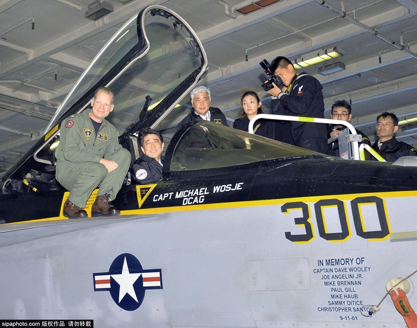 18日,安倍首次登上美軍核航母,體驗F-18戰機。