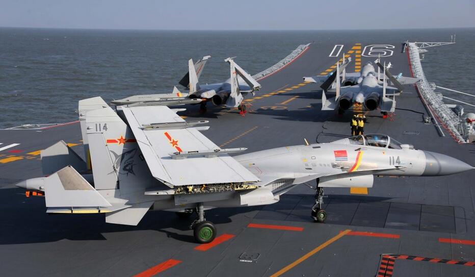 多架殲-15艦載機掛彈在遼寧艦上起降訓練。