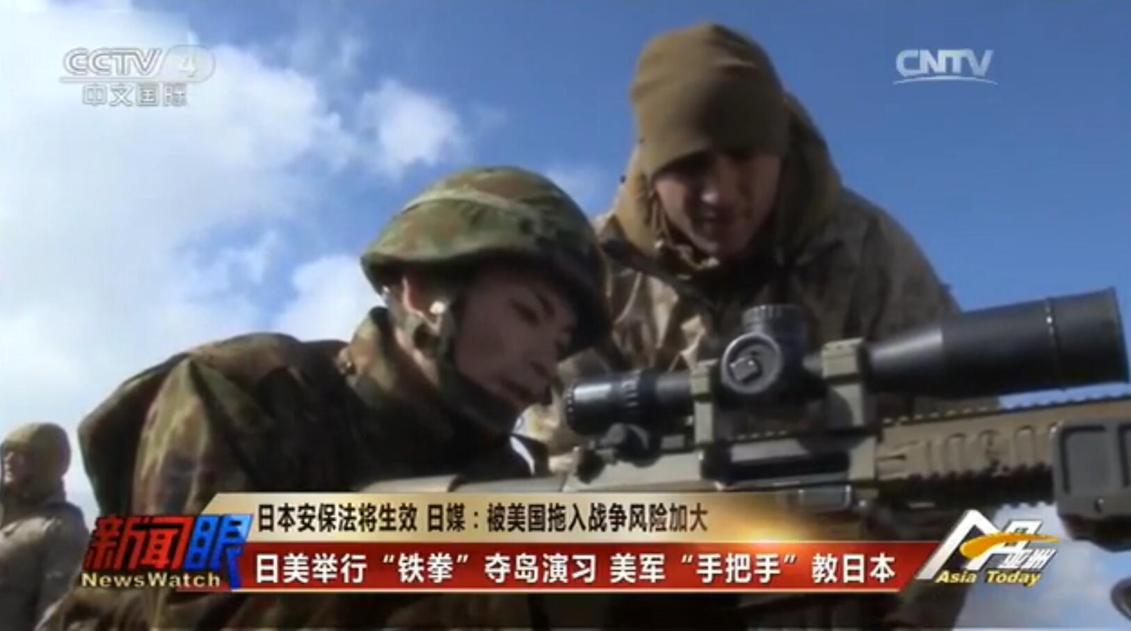 央視截圖:美海軍陸戰隊員“手把手”教日本自衛隊員兩棲登陸作戰技能