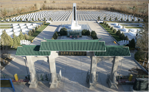 步入陵園,蒼松掩映,紅柳成行,象征東風人扎根戈壁、志在航天的東風革命烈士紀念碑劍指蒼穹。碑座下,安放著聶榮臻元帥的骨灰。93枚盛開的漢白玉花朵組成的花環,覆蓋著老帥的英靈。聶帥身后,730座墓碑排列成整齊的軍陣,寂然佇立,如同整裝待發的將士,令人肅然。