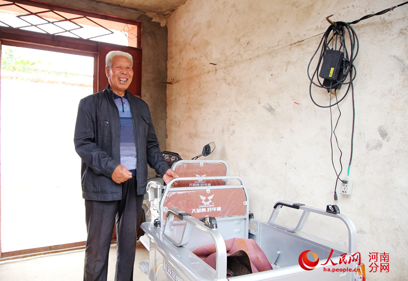 人民網南陽10月10日電(辛靜) “恁看看,這是俺前幾天剛買的電動三輪,也是俺家擺脫貧困的一個紀念,以后俺的日子算是有指望、有奔頭了!”10月9日下午,“長征路上奔小康”采訪團剛走進高大爺家,他便指著自己的“寶貝”笑得合不攏嘴。