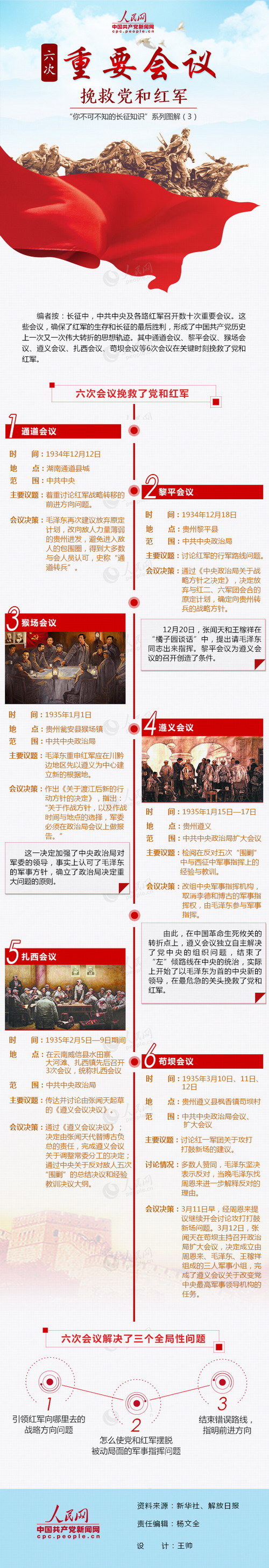 在縱橫十余省、長驅數萬里的長征中,黨和紅軍召開的這些重要會議,正確解決了關系黨和紅軍前途命運的三個全局性問題:一是引領紅軍向哪里去的戰略方向問題;二是怎么使黨和紅軍擺脫被動局面的軍事指揮問題;三是結束“左”傾教條主義錯誤及同張國燾分裂黨和紅軍的錯誤作斗爭的問題。由此,保證了黨的正確路線方針政策的貫徹執行,確保了紅軍的生存和長征的最后勝利。這一點在遵義會議前后的幾次重大會議上,得到了有力體現。
