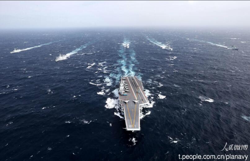 中國海軍官方微博曝光遼寧艦艦艇編隊遠海訓練的畫面。