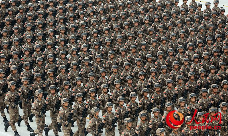 鐵軍“劉老莊連”英模部隊方隊官兵步伐一致,軍紀嚴明。