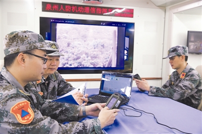 福建省泉州市人防辦工作人員運用北斗系統進行指揮。祖亞輝攝