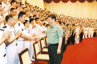 習近平強調,要堅持從思想上政治上建強海軍。要增強“四個意識”,堅決維護黨中央權威,毫不動搖堅持黨對軍隊絕對領導,深入貫徹古田全軍政治工作會議精神,扎實開展主題教育活動,推進“兩學一做”學習教育常態化制度化,切實做好意識形態工作,全面徹底肅清郭伯雄、徐才厚流毒影響,確保人民海軍忠于黨、艦行萬里不迷航。要保持定力、壓實責任,強化監督執紀問責,推動正風肅紀反腐向縱深發展。各級黨委要加強自身建設和政治歷練,著力提高發現和解決自身問題的能力,把班子管好、把隊伍帶好。要按照軍隊好干部標準選人用人,培養大批高素質新型軍事人才。要把工作重心放在基層,滿腔熱情關心關愛官兵,激發官兵扎根海疆、建功大洋的積極性、主動性、創造性,共同為建設強大的現代化海軍而奮斗。