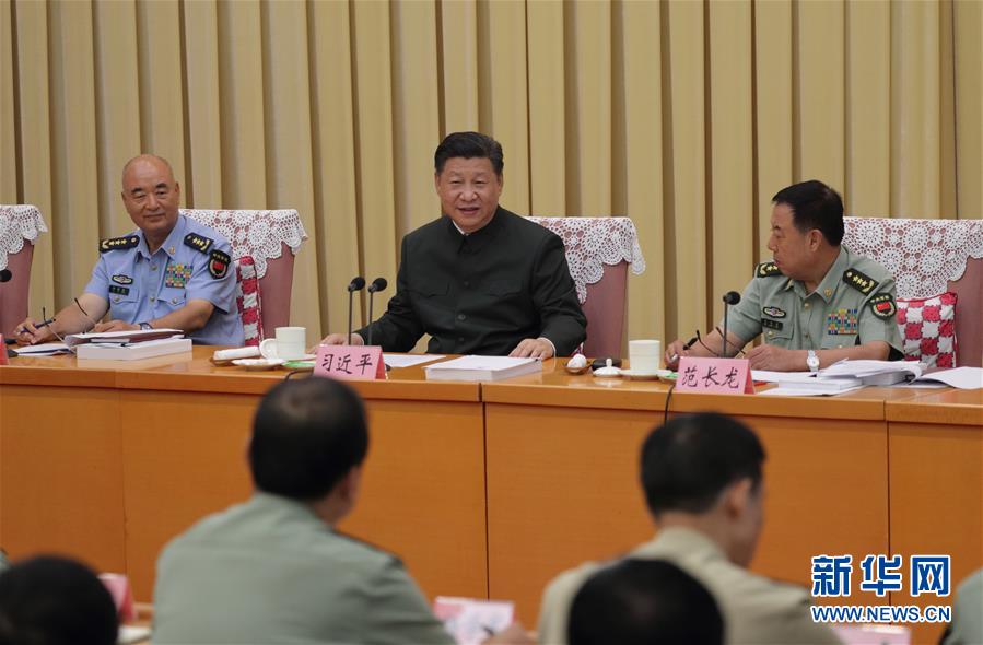 7月19日,新調整組建的軍事科學院、國防大學、國防科技大學成立大會暨軍隊院校、科研機構、訓練機構主要領導座談會在北京八一大樓舉行。中共中央總書記、國家主席、中央軍委主席習近平向軍事科學院、國防大學、國防科技大學授軍旗、致訓詞,出席座談會并發表重要講話。新華社記者 李剛 攝