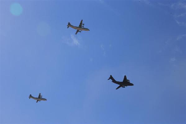 在30日舉行的慶祝中國人民解放軍建軍90周年閱兵中,1架運—20和2架運—9運輸機組成運輸機梯隊,以楔隊隊形接受檢閱。