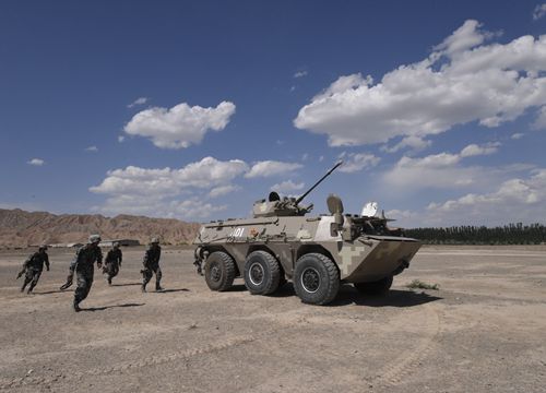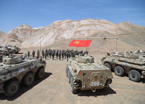 7月的喀喇昆侖山下某駐訓地,驕陽似火。六連官兵頂烈日、戰酷暑,進行輪式步戰車登車和步車協調作戰訓練,將汗水灑在練兵場上,將責任使命凝聚在訓練場上的聲聲號角中。
