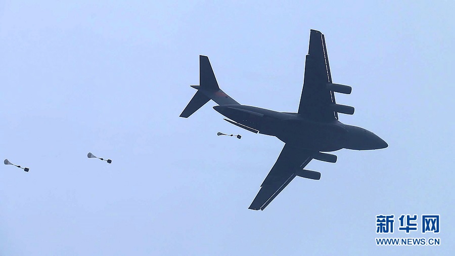 中國空軍大型運輸機運-20與空降兵部隊聯合開展空降空投訓練(資料照片)
