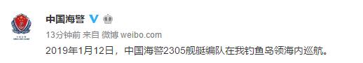人民網北京1月12日電 據中國海警局官方微博消息,2019年1月12日,中國海警2305艦艇編隊在我釣魚島領海內巡航。