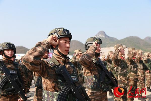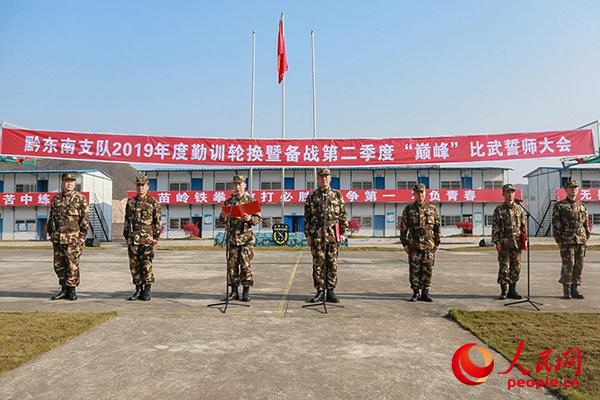 人民網北京4月4日電 為進一步提振士氣、激勵斗志,激發練兵備戰熱情。近日,武警貴州總隊黔東南支隊召開2019年度勤訓輪換暨備戰第二季度“巔峰”比武集訓誓師大會,支隊黨委常委、全體機關干部、執勤分隊應急班和機動中隊官兵參加了誓師大會。