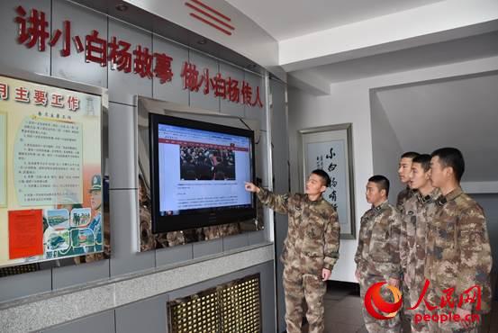 連隊官兵在“信息視窗“前瀏覽新聞。(攝影:王超)