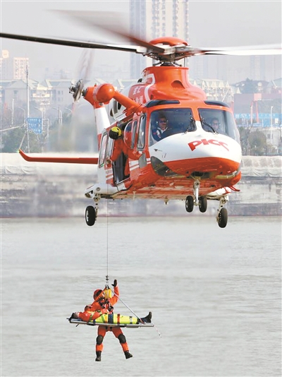 近日,上海市浦東新區軍地聯合組織民兵直升機救援分隊進行水上救援、人員轉運等10多個課目的演練,進一步提高了救援分隊的應急救援能力。 郭彬 攝
