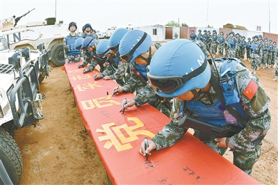 赴馬里維和警衛分隊黨員突擊隊成員在橫幅上簽名。孫伯語 攝