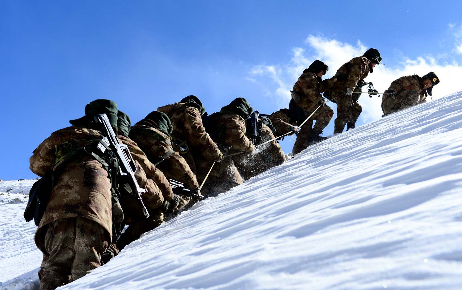 風吼雪舞,天地一片混沌。爬過一個山頭又一個山頭,雪越下越大。又過了一個小時,當隊伍就快要接近18號界碑時,山上的能見度越來越低,“只能看清腳下的路,再遠就看不見了”。雪水把衣服打濕,風又把衣服吹干,裹著泥水的巡邏隊員在風雪中艱難地緩緩挪動,這時有兩名新兵開始發燒。
