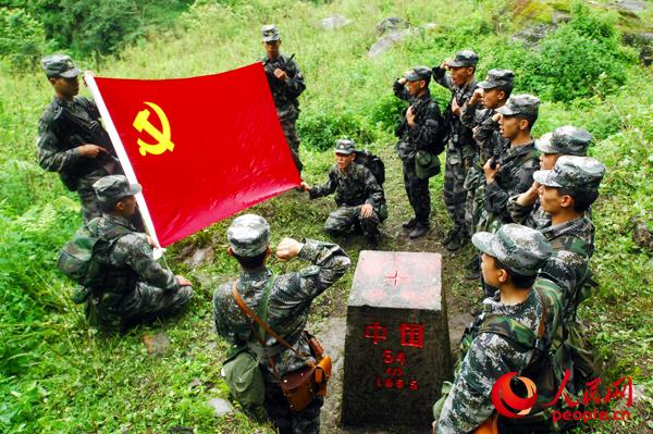 樟木邊防連官兵巡邏到達界碑前,向黨旗宣誓。宋小理攝