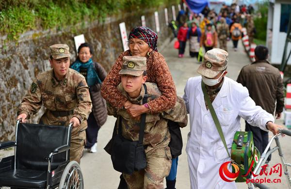 2015年4月尼泊爾大地震,樟木邊防連抗震救災,官兵護送癱瘓老人離開樟木。張震攝