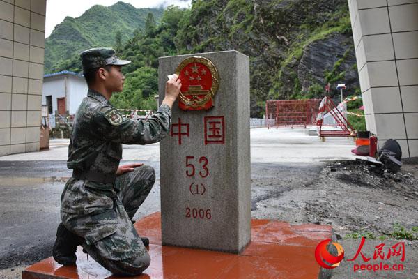 新兵王映輝擦拭界碑上的國徽。 許鵬飛攝