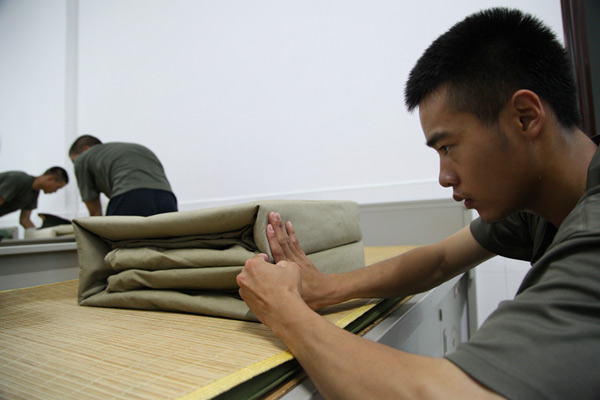 6點,晨光微熹,起床號準時響起,官兵們迅速起床,穿衣、疊被、洗漱10分鐘內完成。整理后的宿舍干凈整潔,一塵不染,每張床的床單緊繃,被子疊得像豆腐塊一樣,桌子上沒有任何雜物。