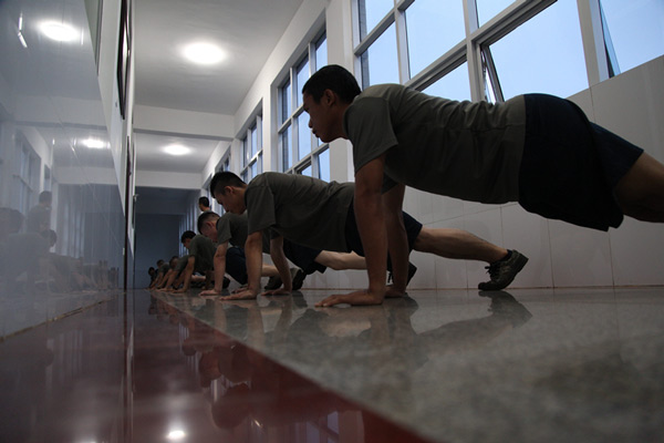 集合完畢的官兵們開始了一天的早操訓練,個個精神抖擻、動作規范,完成了一系列早操體能訓練后,官兵們的衣服已經濕透。