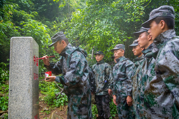 界碑是祖國神圣領土的象征,巡邏途中,官兵們拿出毛筆,輕蘸朱漆,對1099號界碑進行描紅,讓界碑看起來更加莊嚴。