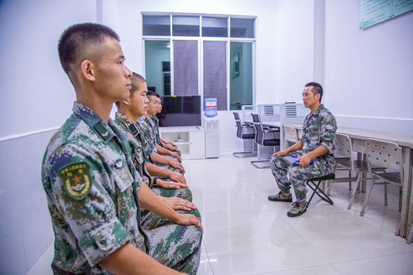 夜深了,宿舍里的鼾聲此起彼伏,白天的巡邏和訓練強度很大,戰士們都睡得很香。連長楊盛強卻還在營門口查哨,在宿舍查鋪,身為主官,楊盛強經常早起晚睡,把青春的剪影留在了營區的夜色中。