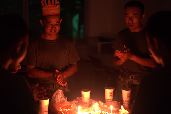“祝你生日快樂,祝你生日快樂……”晚上,宿舍傳來了愉快的祝福歌聲,采訪分隊正巧趕上六班戰士們在為副班長尹江過生日。蛋糕、蠟燭、生日帽,樣樣都有;許愿、吹蠟燭、切蛋糕,一個不落。閃爍的燭光照亮了官兵們的面龐,現場洋溢著濃濃的歡樂氣氛。尹江告訴記者說:“又長一歲,肩上的責任和使命就又多了一分,這個生日我永遠都不會忘記!