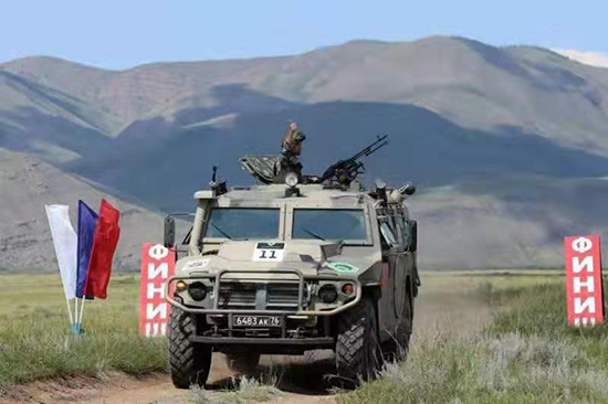 上午11時30分,中國隊駕駛的11號戰車緩緩抵達出發線。隨著指揮旗落下,駕駛員李中秋將車輛瞬間啟動,如離弦之箭快速向前駛去。到達領彈處,他迅速下車,三步并作兩步沖上前領取裝有40發子彈的彈鼓。射手李坤鋒將射擊窗口打開,安裝車載機槍架和俄式車載機槍。完成一切準備后,車輛再次出發,向射擊地域前進。