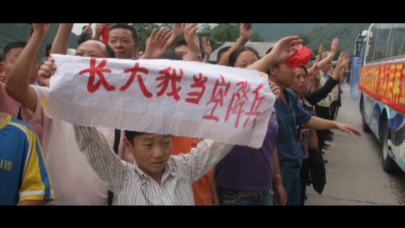 在最后送別救援部隊的人群中,12歲的程強舉起了“長大我當空降兵”的橫幅。這一幕,成為汶川災區群眾為人民子弟兵送行的經典畫面。
