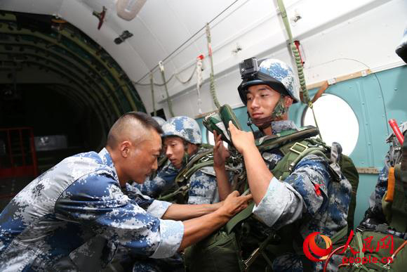 程強跳傘前在機艙內進行最后的檢查(賈光輝 攝)