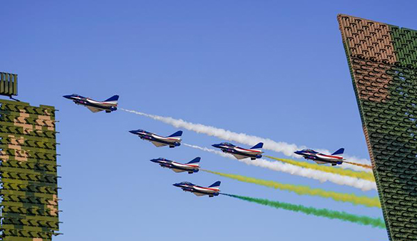 10月21日,在慶祝人民空軍成立70周年為主題的航空開放活動上,空軍八一飛行表演隊殲-10飛機編隊從靜態展示的新型雷達上空飛過。 萬全 攝