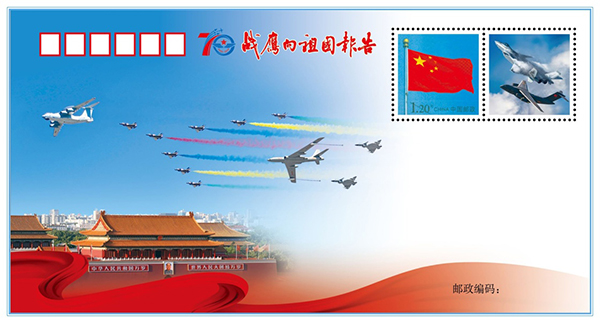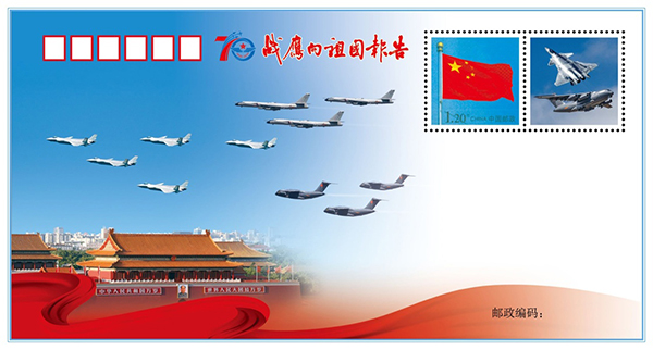 《戰鷹向祖國報告》紀念封之一。 10月18日,慶祝人民空軍成立70周年航空開放活動迎來首個公眾日,空軍在活動現場發布一套兩枚強軍主題紀念封《戰鷹向祖國報告》,展現空軍殲-20、運-20、轟-6N等新型戰機的藍天英姿。